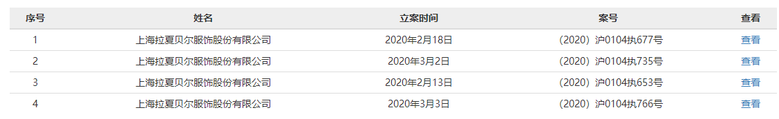 此前的2月13日、2月18日,拉夏貝爾兩次被上海市徐匯區(qū)人民政府列為被執(zhí)行人,執(zhí)行標(biāo)的分別為3268115元和6935159元。至3月3日,拉夏貝爾進(jìn)入2020年以來(lái)已四次被上海市徐匯區(qū)人民法院列為被執(zhí)行人,四起案件執(zhí)行標(biāo)的合計(jì)為14120741元。